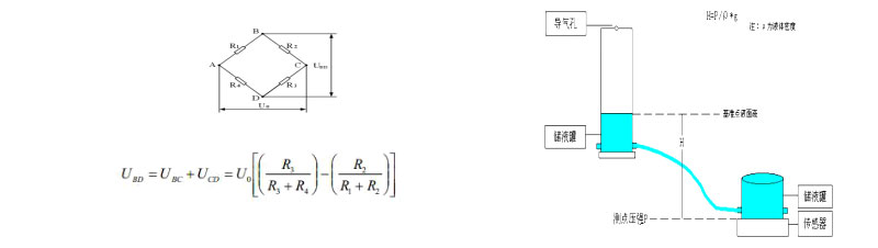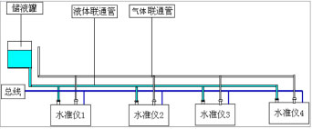 工作原理:各沉降監測點安裝壓阻式靜力水準儀,并需要在一相對不動點安裝基準罐。傳感器之間通過高強度的氣壓管聯接一起匯入到基準罐,每個水準儀內部都安裝有高精硅壓傳感器,在基準罐與傳感器之間充滿液體介質,水準儀內的壓力傳感器感測到的是該點到基準罐液體表面的壓力,該壓力與液面高度有一定線性關系。如果壓力傳感器感測到壓力發生變化即說明該點與基準液面之間的高差發生變化,根據出廠前的壓力變化量與液面高差的標定線性表,靜力水準儀內部的單片機可以計算出高差變化值。根H=P/ρ*g計算出從測點到基準點液面到傳感器高度。原理示意圖如下: